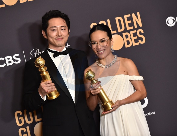 Steven Yeun and Ali Wong in the pressroom at the 81st Golden Globe Awards held at the Beverly Hilton Hotel on January 7, 2024 in Beverly Hills, CA.© OConnor-Arroyo / AFF-USA.com