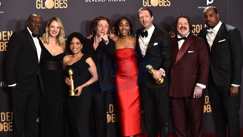 Edwin Lee Gibson, Abby Elliott, Liza Colon-Zayas, Jeremy Allen White, Ayo Edebiri, Ebon Moss-Bachrach, Matty Matheson and Lionel Boyce in the pressroom at the 81st Golden Globe Awards held at the Beverly Hilton Hotel on January 7, 2024 in Beverly Hills, CA.© OConnor-Arroyo / AFF-USA.com