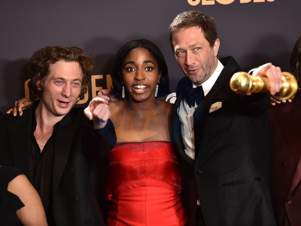 Jeremy Allen White, Ayo Edebiri, Ebon Moss-Bachrach in the pressroom at the 81st Golden Globe Awards held at the Beverly Hilton Hotel on January 7, 2024 in Beverly Hills, CA.© OConnor-Arroyo / AFF-USA.com