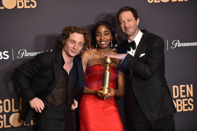 Jeremy Allen White, Ayo Edebiri, Ebon Moss-Bachrach in the pressroom at the 81st Golden Globe Awards held at the Beverly Hilton Hotel on January 7, 2024 in Beverly Hills, CA.© OConnor-Arroyo / AFF-USA.com
