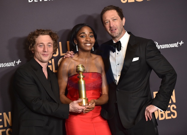 Jeremy Allen White, Ayo Edebiri, Ebon Moss-Bachrach in the pressroom at the 81st Golden Globe Awards held at the Beverly Hilton Hotel on January 7, 2024 in Beverly Hills, CA.© OConnor-Arroyo / AFF-USA.com