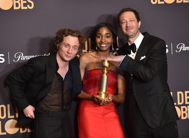 Jeremy Allen White, Ayo Edebiri, Ebon Moss-Bachrach in the pressroom at the 81st Golden Globe Awards held at the Beverly Hilton Hotel on January 7, 2024 in Beverly Hills, CA.© OConnor-Arroyo / AFF-USA.com