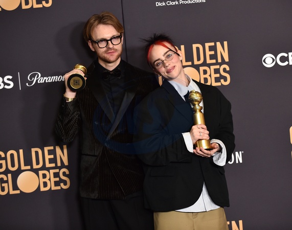 Finneas O'Connell and Billie Eilish in the pressroom at the 81st Golden Globe Awards held at the Beverly Hilton Hotel on January 7, 2024 in Beverly Hills, CA.© OConnor-Arroyo / AFF-USA.com