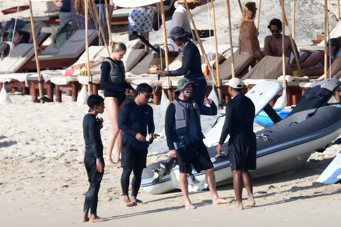 Exclusif - Prix spécial - No Web - Exclusif - Prix spécial - No Web - Jason Statham et sa compagne Rosie Huntington-Whiteley s'essaient à la planche volante ou foil électrique lors de leurs vacances à Phuket, Thaïlande le 2 janvier 2024. Exclusive - For Germany call for price - No web - Jason Statham and his partner Rosie Huntington-Whiteley try out an electric hoverboard or foil during their vacation in Phuket, Thailand on January 2, 2024.