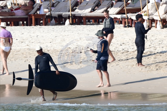 Exclusif - Prix spécial - No Web - Exclusif - Prix spécial - No Web - Jason Statham et sa compagne Rosie Huntington-Whiteley s'essaient à la planche volante ou foil électrique lors de leurs vacances à Phuket, Thaïlande le 2 janvier 2024. Exclusive - For Germany call for price - No web - Jason Statham and his partner Rosie Huntington-Whiteley try out an electric hoverboard or foil during their vacation in Phuket, Thailand on January 2, 2024.