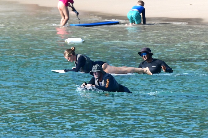 Exclusif - Prix spécial - No Web - Exclusif - Prix spécial - No Web - Jason Statham et sa compagne Rosie Huntington-Whiteley s'essaient à la planche volante ou foil électrique lors de leurs vacances à Phuket, Thaïlande le 2 janvier 2024. Exclusive - For Germany call for price - No web - Jason Statham and his partner Rosie Huntington-Whiteley try out an electric hoverboard or foil during their vacation in Phuket, Thailand on January 2, 2024.