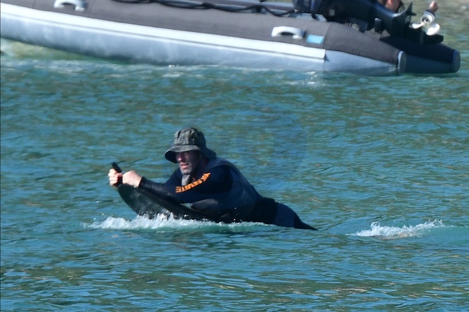 Exclusif - Prix spécial - No Web - Exclusif - Prix spécial - No Web - Jason Statham et sa compagne Rosie Huntington-Whiteley s'essaient à la planche volante ou foil électrique lors de leurs vacances à Phuket, Thaïlande le 2 janvier 2024. Exclusive - For Germany call for price - No web - Jason Statham and his partner Rosie Huntington-Whiteley try out an electric hoverboard or foil during their vacation in Phuket, Thailand on January 2, 2024.