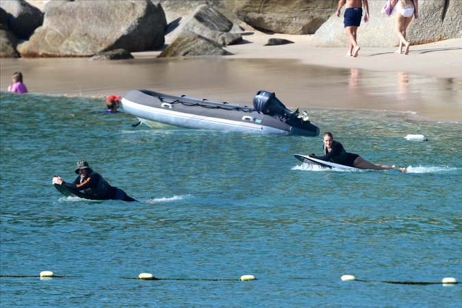Exclusif - Prix spécial - No Web - Exclusif - Prix spécial - No Web - Jason Statham et sa compagne Rosie Huntington-Whiteley s'essaient à la planche volante ou foil électrique lors de leurs vacances à Phuket, Thaïlande le 2 janvier 2024. Exclusive - For Germany call for price - No web - Jason Statham and his partner Rosie Huntington-Whiteley try out an electric hoverboard or foil during their vacation in Phuket, Thailand on January 2, 2024.