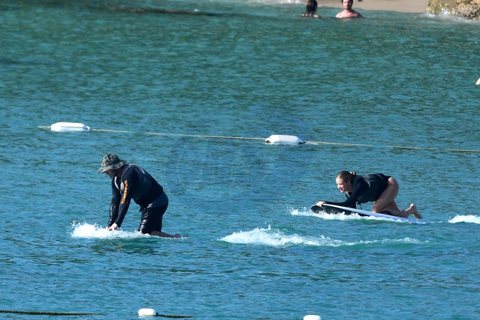 Exclusif - Prix spécial - No Web - Exclusif - Prix spécial - No Web - Jason Statham et sa compagne Rosie Huntington-Whiteley s'essaient à la planche volante ou foil électrique lors de leurs vacances à Phuket, Thaïlande le 2 janvier 2024. Exclusive - For Germany call for price - No web - Jason Statham and his partner Rosie Huntington-Whiteley try out an electric hoverboard or foil during their vacation in Phuket, Thailand on January 2, 2024.
