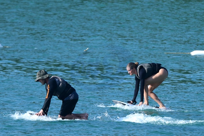 Exclusif - Prix spécial - No Web - Exclusif - Prix spécial - No Web - Jason Statham et sa compagne Rosie Huntington-Whiteley s'essaient à la planche volante ou foil électrique lors de leurs vacances à Phuket, Thaïlande le 2 janvier 2024. Exclusive - For Germany call for price - No web - Jason Statham and his partner Rosie Huntington-Whiteley try out an electric hoverboard or foil during their vacation in Phuket, Thailand on January 2, 2024.