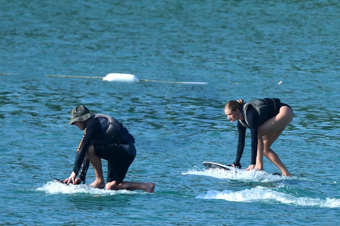 Exclusif - Prix spécial - No Web - Exclusif - Prix spécial - No Web - Jason Statham et sa compagne Rosie Huntington-Whiteley s'essaient à la planche volante ou foil électrique lors de leurs vacances à Phuket, Thaïlande le 2 janvier 2024. Exclusive - For Germany call for price - No web - Jason Statham and his partner Rosie Huntington-Whiteley try out an electric hoverboard or foil during their vacation in Phuket, Thailand on January 2, 2024.