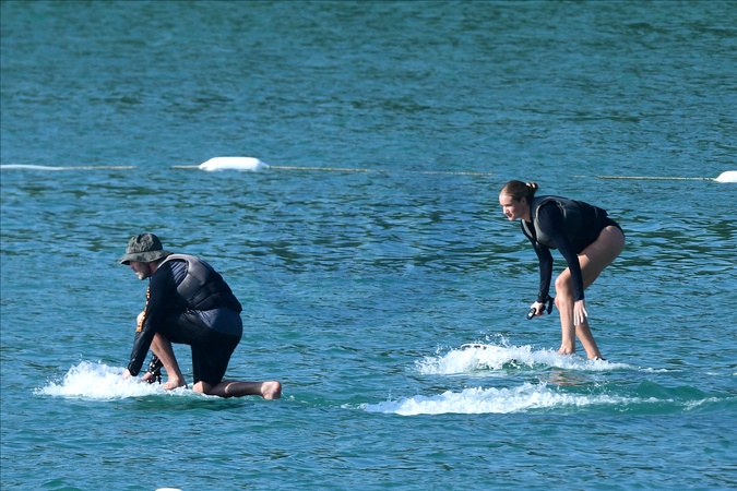 Exclusif - Prix spécial - No Web - Exclusif - Prix spécial - No Web - Jason Statham et sa compagne Rosie Huntington-Whiteley s'essaient à la planche volante ou foil électrique lors de leurs vacances à Phuket, Thaïlande le 2 janvier 2024. Exclusive - For Germany call for price - No web - Jason Statham and his partner Rosie Huntington-Whiteley try out an electric hoverboard or foil during their vacation in Phuket, Thailand on January 2, 2024.