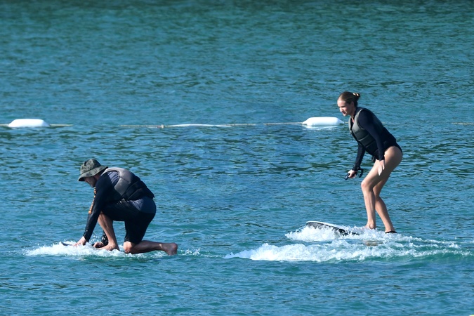 Exclusif - Prix spécial - No Web - Exclusif - Prix spécial - No Web - Jason Statham et sa compagne Rosie Huntington-Whiteley s'essaient à la planche volante ou foil électrique lors de leurs vacances à Phuket, Thaïlande le 2 janvier 2024. Exclusive - For Germany call for price - No web - Jason Statham and his partner Rosie Huntington-Whiteley try out an electric hoverboard or foil during their vacation in Phuket, Thailand on January 2, 2024.
