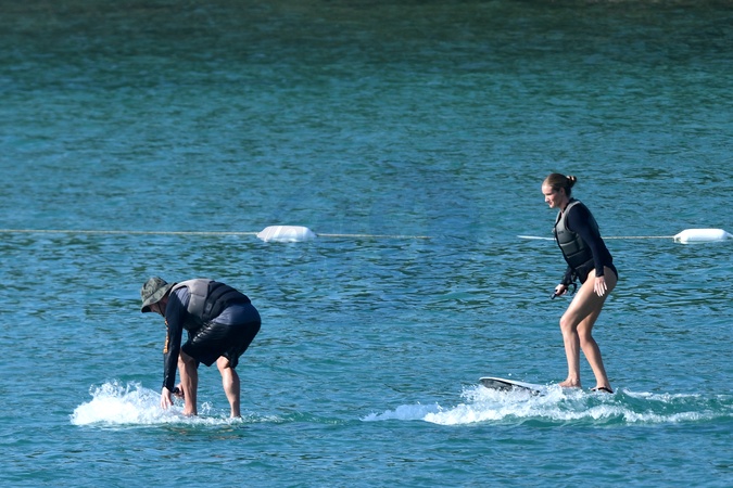 Exclusif - Prix spécial - No Web - Exclusif - Prix spécial - No Web - Jason Statham et sa compagne Rosie Huntington-Whiteley s'essaient à la planche volante ou foil électrique lors de leurs vacances à Phuket, Thaïlande le 2 janvier 2024. Exclusive - For Germany call for price - No web - Jason Statham and his partner Rosie Huntington-Whiteley try out an electric hoverboard or foil during their vacation in Phuket, Thailand on January 2, 2024.