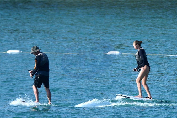 Exclusif - Prix spécial - No Web - Exclusif - Prix spécial - No Web - Jason Statham et sa compagne Rosie Huntington-Whiteley s'essaient à la planche volante ou foil électrique lors de leurs vacances à Phuket, Thaïlande