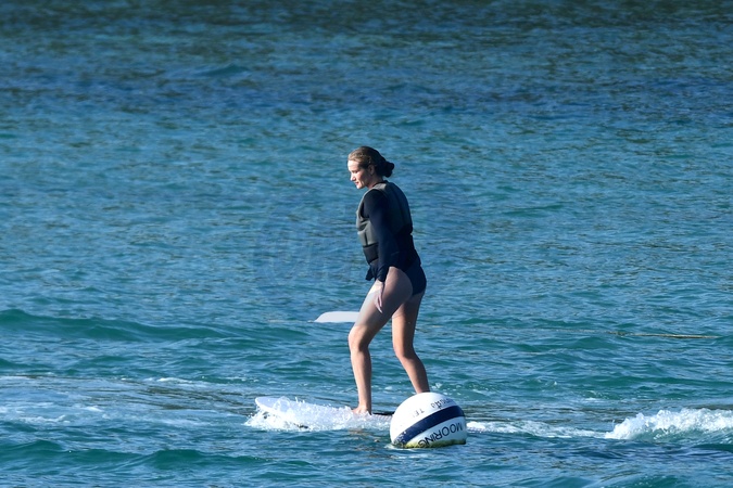 Exclusif - Prix spécial - No Web - Exclusif - Prix spécial - No Web - Jason Statham et sa compagne Rosie Huntington-Whiteley s'essaient à la planche volante ou foil électrique lors de leurs vacances à Phuket, Thaïlande le 2 janvier 2024. Exclusive - For Germany call for price - No web - Jason Statham and his partner Rosie Huntington-Whiteley try out an electric hoverboard or foil during their vacation in Phuket, Thailand on January 2, 2024.