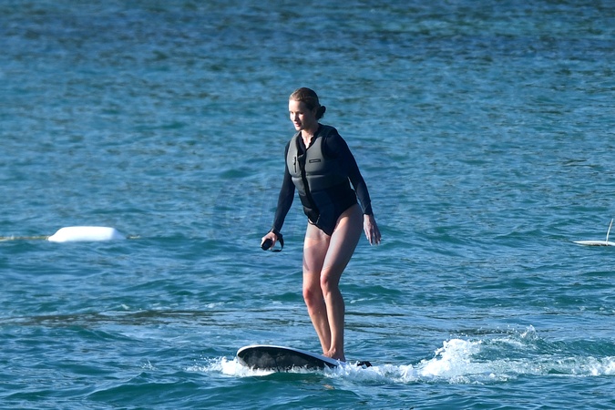 Exclusif - Prix spécial - No Web - Exclusif - Prix spécial - No Web - Jason Statham et sa compagne Rosie Huntington-Whiteley s'essaient à la planche volante ou foil électrique lors de leurs vacances à Phuket, Thaïlande le 2 janvier 2024. Exclusive - For Germany call for price - No web - Jason Statham and his partner Rosie Huntington-Whiteley try out an electric hoverboard or foil during their vacation in Phuket, Thailand on January 2, 2024.