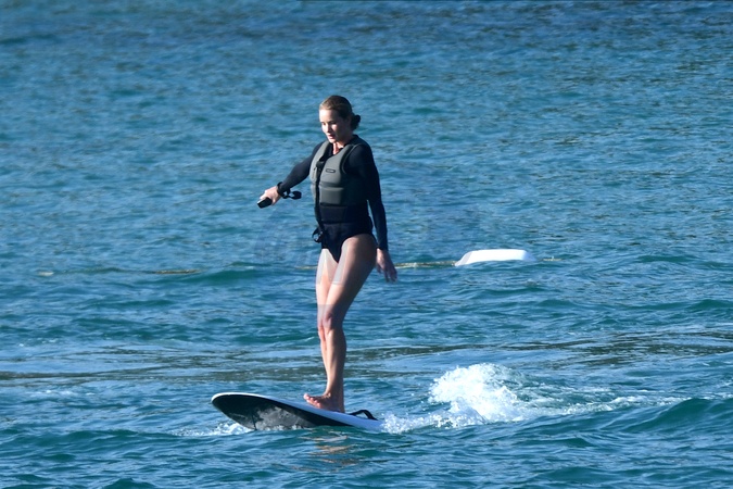 Exclusif - Prix spécial - No Web - Exclusif - Prix spécial - No Web - Jason Statham et sa compagne Rosie Huntington-Whiteley s'essaient à la planche volante ou foil électrique lors de leurs vacances à Phuket, Thaïlande le 2 janvier 2024. Exclusive - For Germany call for price - No web - Jason Statham and his partner Rosie Huntington-Whiteley try out an electric hoverboard or foil during their vacation in Phuket, Thailand on January 2, 2024.