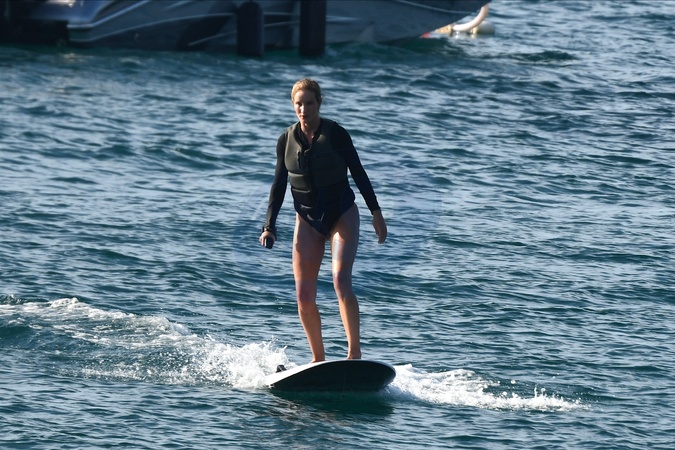 Exclusif - Prix spécial - No Web - Exclusif - Prix spécial - No Web - Jason Statham et sa compagne Rosie Huntington-Whiteley s'essaient à la planche volante ou foil électrique lors de leurs vacances à Phuket, Thaïlande le 2 janvier 2024. Exclusive - For Germany call for price - No web - Jason Statham and his partner Rosie Huntington-Whiteley try out an electric hoverboard or foil during their vacation in Phuket, Thailand on January 2, 2024.