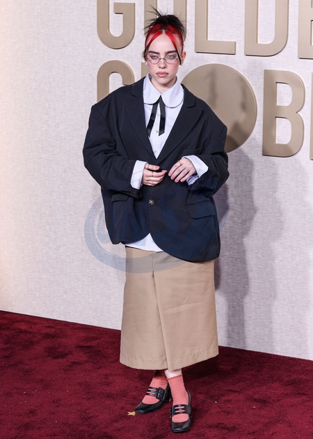BEVERLY HILLS, LOS ANGELES, CALIFORNIA, USA - JANUARY 07: Billie Eilish wearing Willy Chavarria with jewelry by Assael and Anita Ko, plus Oliver Peoples glasses arrives at the 81st Annual Golden Globe Awards held at The Beverly Hilton Hotel on January 7, 2024 in Beverly Hills, Los Angeles, California, United States., Credit:Xavier Collin / Avalon