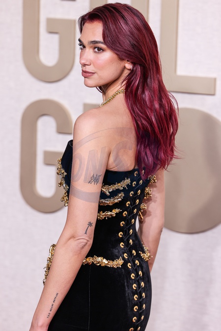 BEVERLY HILLS, LOS ANGELES, CALIFORNIA, USA - JANUARY 07: Dua Lipa wearing a custom Schiaparelli dress, Jimmy Choo shoes, and Tiffany and Co. jewelry arrives at the 81st Annual Golden Globe Awards held at The Beverly Hilton Hotel on January 7, 2024 in Beverly Hills, Los Angeles, California, United States., Credit:Xavier Collin / Avalon