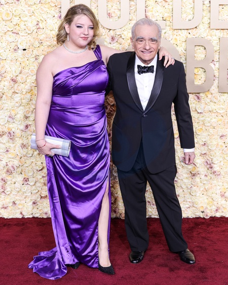 BEVERLY HILLS, LOS ANGELES, CALIFORNIA, USA - JANUARY 07: Francesca Scorsese and father Martin Scorsese arrive at the 81st Annual Golden Globe Awards held at The Beverly Hilton Hotel on January 7, 2024 in Beverly Hills, Los Angeles, California, United States., Credit:Xavier Collin / Avalon