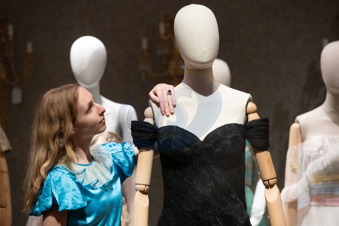Staff members adjust Princess Diana's 'The 'revenge' dress' worn by Elizabeth Debicki (est. £8,000 - £12,000) on The Crown series which is to go on auction at Bonhams The Crown Netflix Series Sale online from 11th Jan - 8th Feb and live on 7th Feb 2024 - Bonhams, London, England, UK on Tuesday 9 January, 2024., Credit:Justin Ng / Avalon