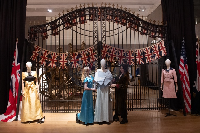 Staff members adjust (L) - 'A floor length silk evening gown' (£1,500, - £2,000), (M) - 'A floor-length evening gown and wrap' (est. £2,000 - £3,000), (R) - 'A pink bouclé Chanel-inspired skirt suit' all as worn by Jodi Balfour (as Jackie Kennedy) on The Crown series which is to go on auction at Bonhams The Crown Netflix Series Sale online from 11th Jan - 8th Feb and live on 7th Feb 2024 - Bonhams, London, England, UK on Tuesday 9 January, 2024., Credit:Justin Ng / Avalon