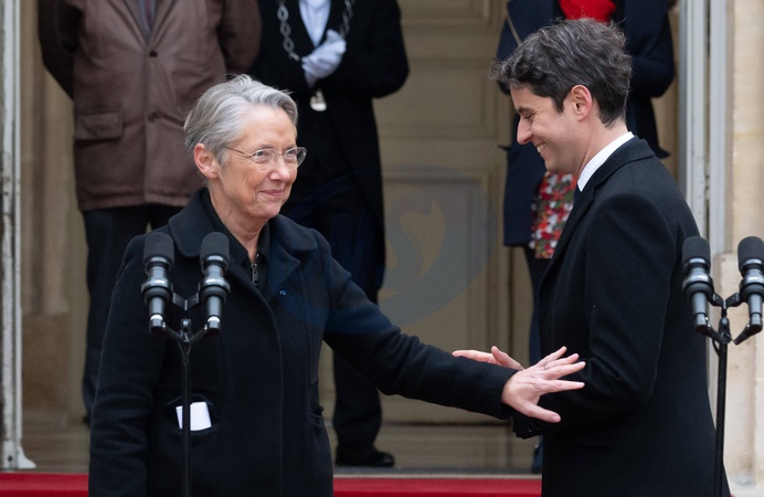 Przekazanie władzy pomiędzy byłą premier Elisabeth Borne a nowym premierem Gabrielem Attalem w Hôtel de Matignon w Paryżu.
