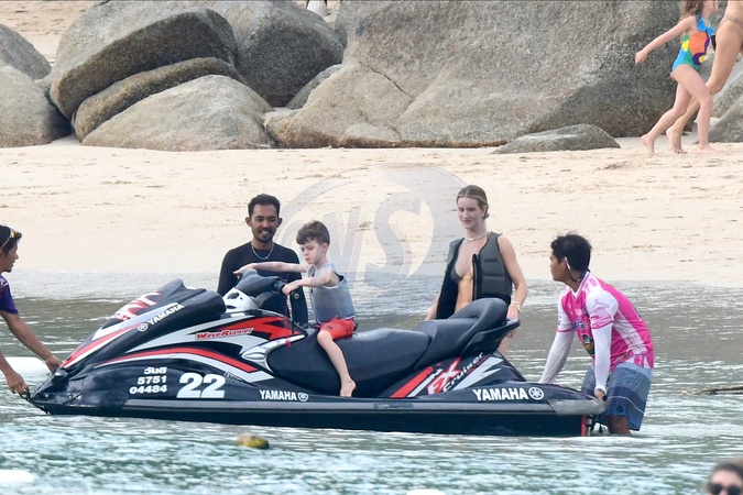 Exclusif - Prix spécial - No Web - Rosie Huntington-Whiteley fait un tour à jet-ski avec son fils Jack lors de leurs vacances à Phuket le 28 décembre 2023. Exclusive - No web For Germany call for price Rosie Huntington-Whiteley takes a jet-ski ride with her son Jack during their holiday in Phuket on 28 December 2023. — Please pixelate children face prior to publication —