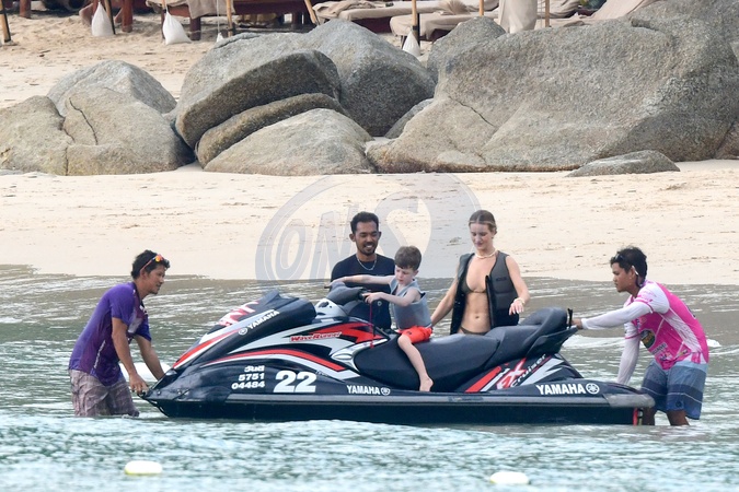 Exclusif - Prix spécial - No Web - Rosie Huntington-Whiteley fait un tour à jet-ski avec son fils Jack lors de leurs vacances à Phuket