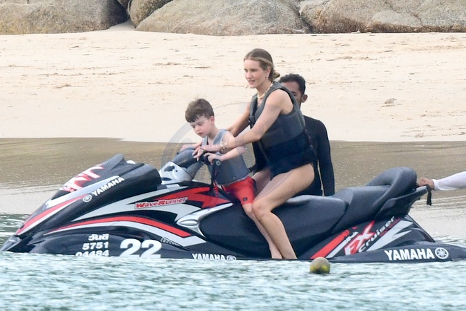 Exclusif - Prix spécial - No Web - Rosie Huntington-Whiteley fait un tour à jet-ski avec son fils Jack lors de leurs vacances à Phuket le 28 décembre 2023. Exclusive - No web For Germany call for price Rosie Huntington-Whiteley takes a jet-ski ride with her son Jack during their holiday in Phuket on 28 December 2023. — Please pixelate children face prior to publication —