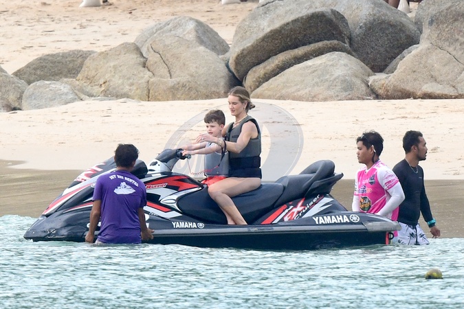 Exclusif - Prix spécial - No Web - Rosie Huntington-Whiteley fait un tour à jet-ski avec son fils Jack lors de leurs vacances à Phuket le 28 décembre 2023. Exclusive - No web For Germany call for price Rosie Huntington-Whiteley takes a jet-ski ride with her son Jack during their holiday in Phuket on 28 December 2023. — Please pixelate children face prior to publication —