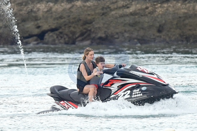 Exclusif - Prix spécial - No Web - Rosie Huntington-Whiteley fait un tour à jet-ski avec son fils Jack lors de leurs vacances à Phuket