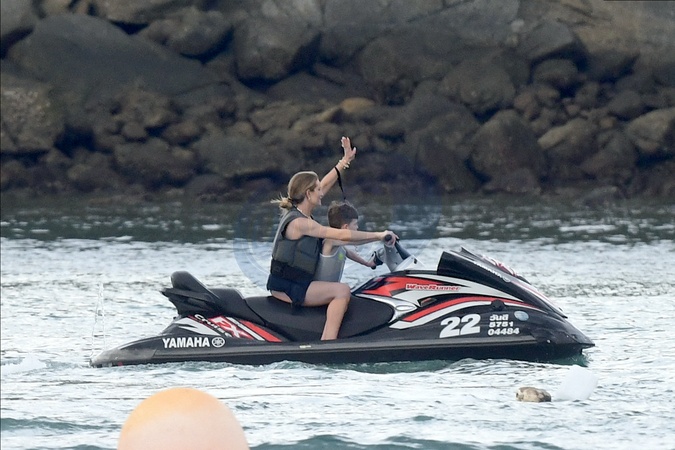 Exclusif - Prix spécial - No Web - Rosie Huntington-Whiteley fait un tour à jet-ski avec son fils Jack lors de leurs vacances à Phuket