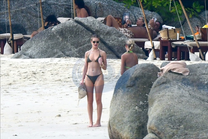 Exclusif - Prix spécial - No Web - Rosie Huntington-Whiteley fait un tour à jet-ski avec son fils Jack lors de leurs vacances à Phuket le 28 décembre 2023. Exclusive - No web For Germany call for price Rosie Huntington-Whiteley takes a jet-ski ride with her son Jack during their holiday in Phuket on 28 December 2023. — Please pixelate children face prior to publication —