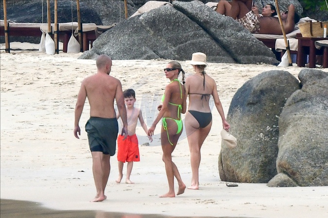 Exclusif - Prix spécial - No Web - Rosie Huntington-Whiteley fait un tour à jet-ski avec son fils Jack lors de leurs vacances à Phuket le 28 décembre 2023. Exclusive - No web For Germany call for price Rosie Huntington-Whiteley takes a jet-ski ride with her son Jack during their holiday in Phuket on 28 December 2023. — Please pixelate children face prior to publication —