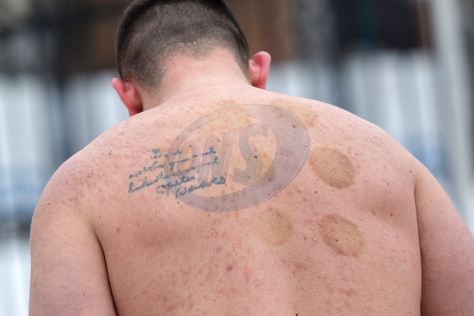 KYIV, UKRAINE - JANUARY 6, 2024 - Marks from cupping therapy are seen on the man's back in Hidropark on Epiphany, Kyiv, capital of Ukraine., Credit:Kirill Chubotin / Avalon