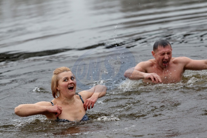 KYIV, UKRAINE - JANUARY 6, 2024 - People bathe in the Dnipro River in Hidropark on Epiphany, Kyiv, capital of Ukraine., Credit:Kirill Chubotin / Avalon
