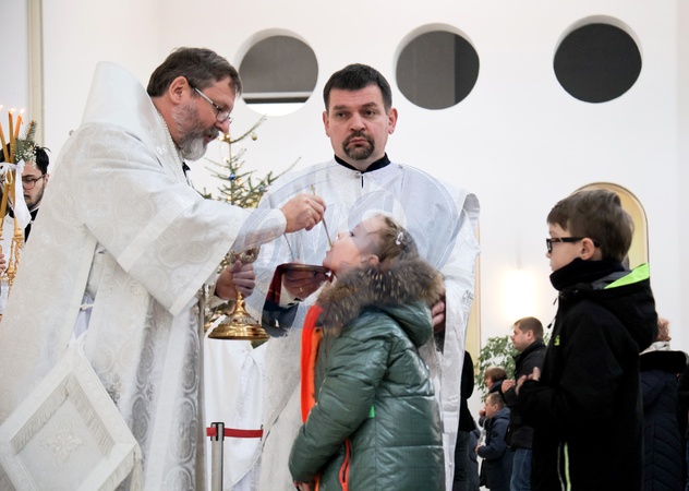 KYIV, UKRAINE - JANUARY 6, 2024 - Head of the Ukrainian Greek Catholic Church (UGCC) Sviatoslav Shevchuk shares the Holy Communion with children during the divine liturgy at the Cathedral of the Resurrection of Christ on Epiphany, Kyiv, capital of Ukraine., Credit:Eugen Kotenko / Avalon