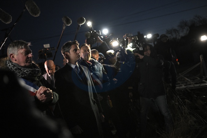 Le nouveau Premier ministre Gabriel Attal lors de son première déplacement dans le village de Clairmarais, pas de Calais, le 9 janvier 2024, village touché par les inondations. © Eliot Blondet/Pool/Bestimage New elected French Prime Minister Gabriel Attal during his first visit like Prime Minister in the village Clairmarais, Pas de Calais, on January 9, 2024, a village afected by floodings.
