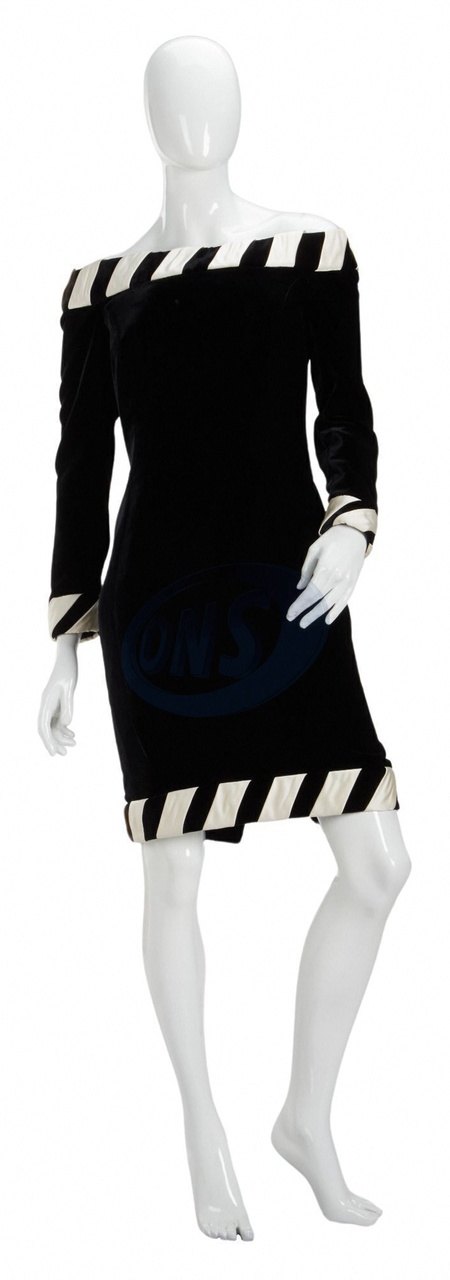 Pictures MUST credit: Julien's Auctions A black cocktail dress worn by the late Princess Diana heads a fashion suction which features clothes from celebrity wardrobes. An 1985 silk and velvet frock was created by one of the Princess of Wales's favourite designers, Catherine Walker and is expected to fetch up to $200,000 USD. It was worn to a private event and features an off-the-shoulder neckline, seamed bodice with boned interior bustier and a knee-length hem. The bias-cut ivory satin accents are sewn at the neckline, cuffs, and hem. The dress is lined with black silk and is designed always to look flawless when worn by Diana. Author and fashion expert Georgina Howell documented Diana's preference in her book, Diana : Her Life In Fashion. She said Diana loved off-the-shoulder and halterneck dresses because they "showed off her spectacular gym tone shoulders.” Picture supplied by JLPPA