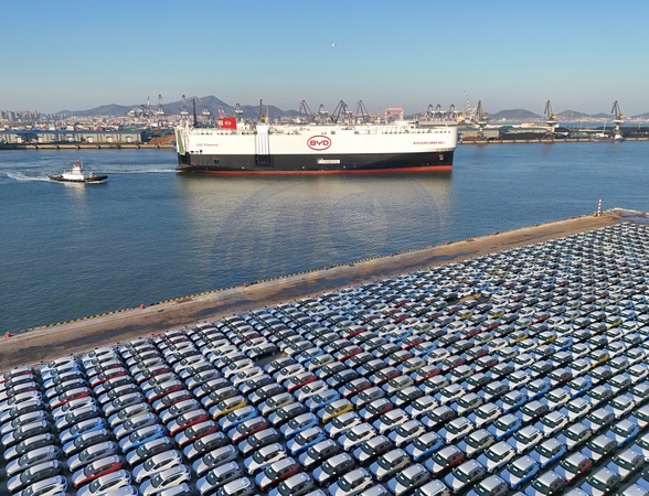 Nowe samochody czekają na załadunek na nowo ukończony statek ro-ro o nazwie BYD Explorer No.1