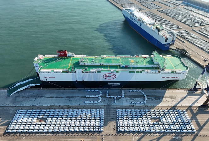 New BYD cars wait to be loaded onto a newly completed ro-ro ship named BYD Explorer No.1 for her maiden voyage in Yantai in east China's Shandong province Wednesday, Jan. 10, 2024. China's BYD has overtaken Tesla as the world's largest maker of pure-electric vehicles., Credit:TANG KE / Avalon