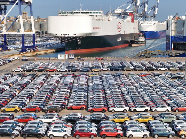 Nowe samochody czekają na załadunek na nowo ukończony statek ro-ro o nazwie BYD Explorer No.1