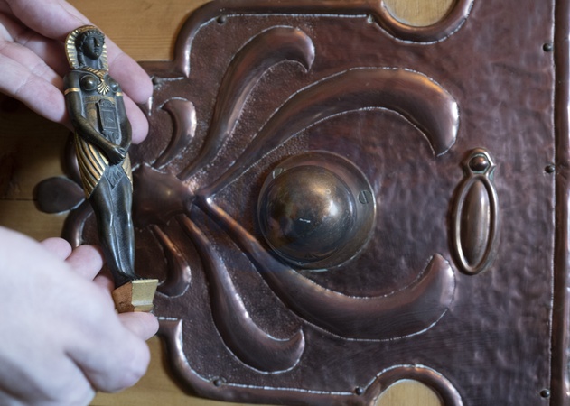 London, UK, 10th January, 2024. Bellmans preparing sell the Collection of the late Anthony Gardner, the notable London-based jewellery dealer and collector, who specialised in the Art Nouveau and Arts & Crafts periods. The auction will take place on 16th April 2024 in Sussex. Image: An Egyptian revival bronze furniture mount against an Arts & Crafts copper door plate., Credit:MALCOLM PARK / Avalon