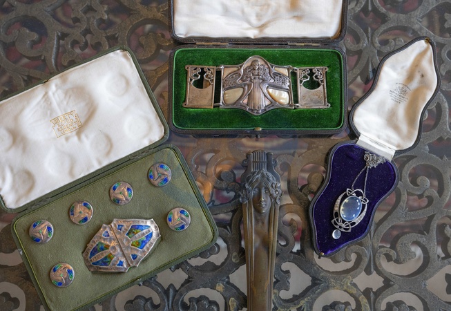 London, UK, 10th January, 2024. Bellmans preparing sell the Collection of the late Anthony Gardner, the notable London-based jewellery dealer and collector, who specialised in the Art Nouveau and Arts & Crafts periods. The auction will take place on 16th April 2024 in Sussex. Image: Jewellery from Anthony Gardner's The Purple Shop will be included in the auction on 16th April. Among them an Art Nouveau Century Moonstone and Diamond pendant, a selection of Liberty buttons and buckles and a silver Art Nouveau belt buckle set with mother of pearl., Credit:MALCOLM PARK / Avalon