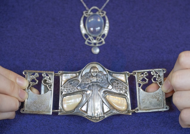 London, UK, 10th January, 2024. Bellmans preparing sell the Collection of the late Anthony Gardner, the notable London-based jewellery dealer and collector, who specialised in the Art Nouveau and Arts & Crafts periods. The auction will take place on 16th April 2024 in Sussex. Image: Jewellery from Anthony Gardner's The Purple Shop will be included in the auction on 16th April. Among them a silver Art Nouveau belt buckle set with mother of pearl., Credit:MALCOLM PARK / Avalon