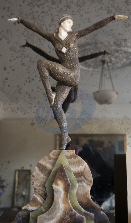 London, UK, 10th January, 2024. Bellmans preparing sell the Collection of the late Anthony Gardner, the notable London-based jewellery dealer and collector, who specialised in the Art Nouveau and Arts & Crafts periods. The auction will take place on 16th April 2024 in Sussex. Image: The mantle piece at Anthony Gardner's former home with an Art Deco bronze figure of a dancer., Credit:MALCOLM PARK / Avalon