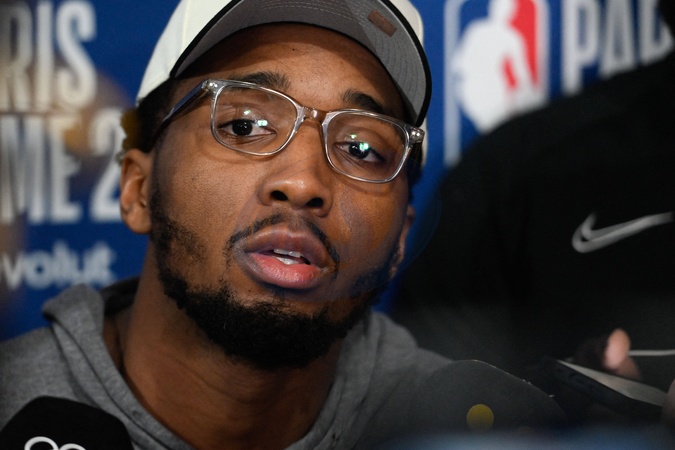 Donovan Mitchell ( 45 - Cleveland Cavaliers ) during the Cleveland Cavaliers press conference at Palais des Sports Marcel Cerdan on January 10, 2024 in Levallois, France. © Federico Pestellini / Panoramic / Bestimage